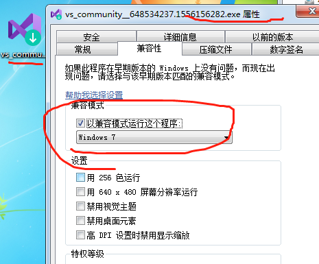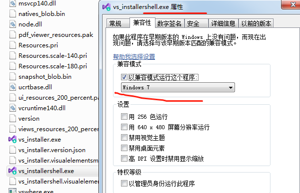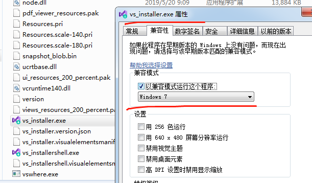 第一步:进入C:\Program Files (x86)\Microsoft Visual Studio\Installer中,找到vs_installer.exe 和 vs_installershell.exe,并分别改变他们的兼容模式,具体如下: