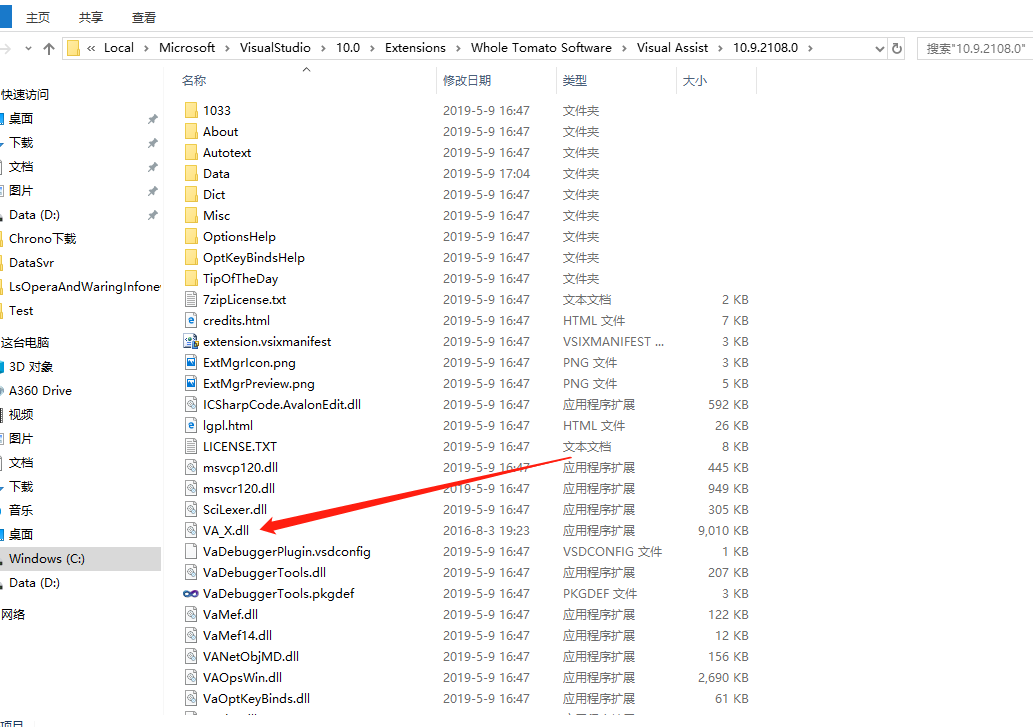 2)然后,在目录C:\Users\82687\AppData\Local\Microsoft\VisualStudio\10.0\Extensions\Whole Tomato Software\Visual Assist\10.9.2108.0