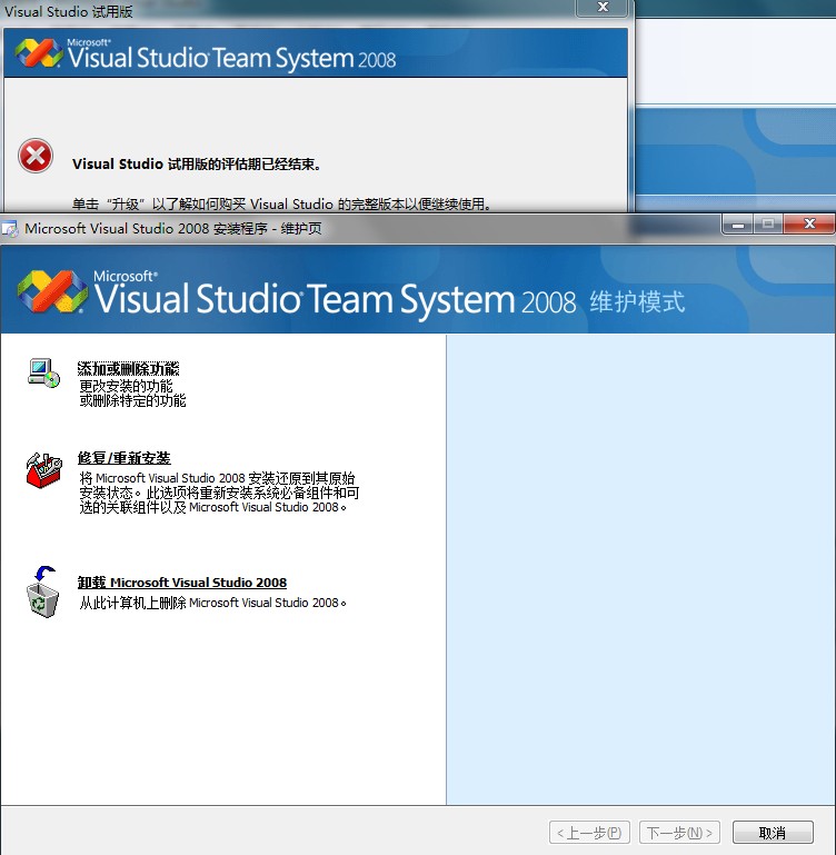 打开 控制面板 –> 添加删除程序, 找到VS2008的安装项,运行 VS2008的安装卸载程序,出现如下的界面