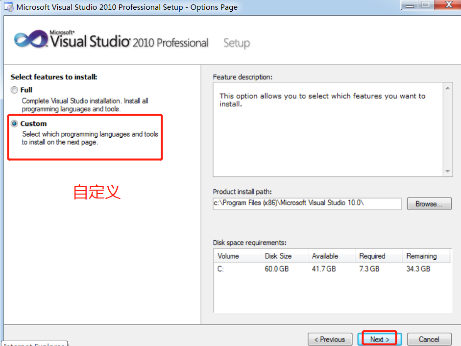 由于我们不需要全部的组件,所以点击“自定义”单选项,再点击“下一步”按钮: