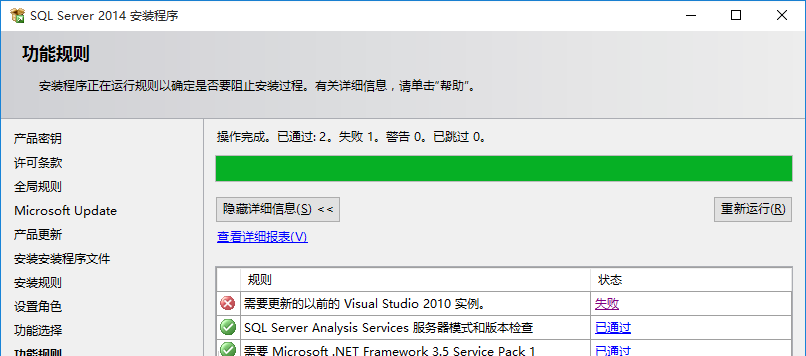 ps1:我在从发现这个问题的时候到安装完这个更新文件期间都没有管SQLServer2014的安装,一直停在最开始提示的那个界面。等着这些工作都做完了,然后点击了那个页面的“重新运行”,之后不再显示错误,然后就继续安装啦。