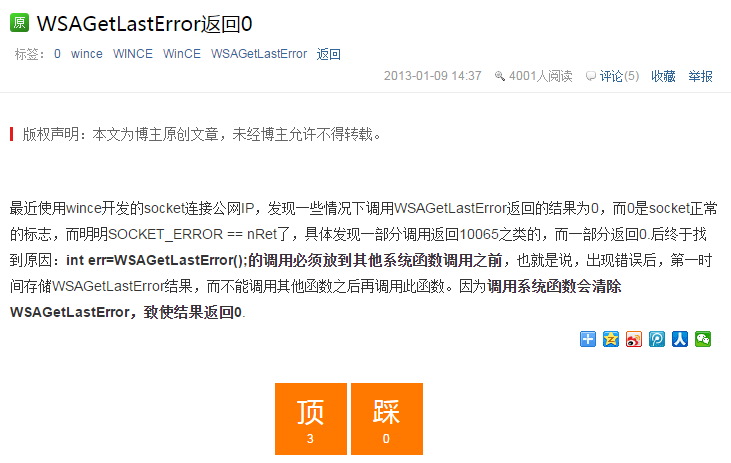 最近使用wince开发的socket连接公网IP,发现一些情况下调用WSAGetLastError返回的结果为0,而0是socket正常的标志,而明明SOCKET_ERROR == nRet了,具体发现一部分调用返回10065之类的,而一部分返回0.后终于找到原因:int err=WSAGetLastError();的调用必须放到其他系统函数调用之前,也就是说,出现错误后,第一时间存储WSAGetLastError结果,而不能调用其他函数之后再调用此函数。因为调用系统函数会清除WSAGetLastError,致使结果返回0.