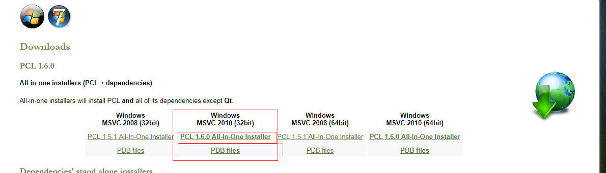 下载PCL1.6.0的pdb文件和VS2010平台的安装文件,如下图:
