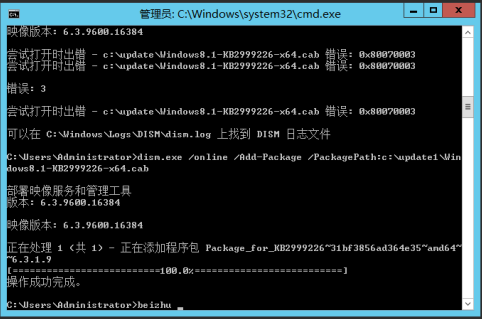 打开cmd 分别执行下面两句。红色部分就是自己的更新程序了。其他安装同理 例如Windows8.1-KB2919442-x64.msu 等