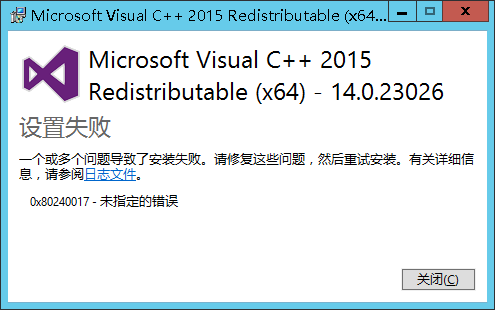 在64位win server2012上安装vs2015注册运行库出错,出现ox80240017-未指定的错误,具体错误信息如下: