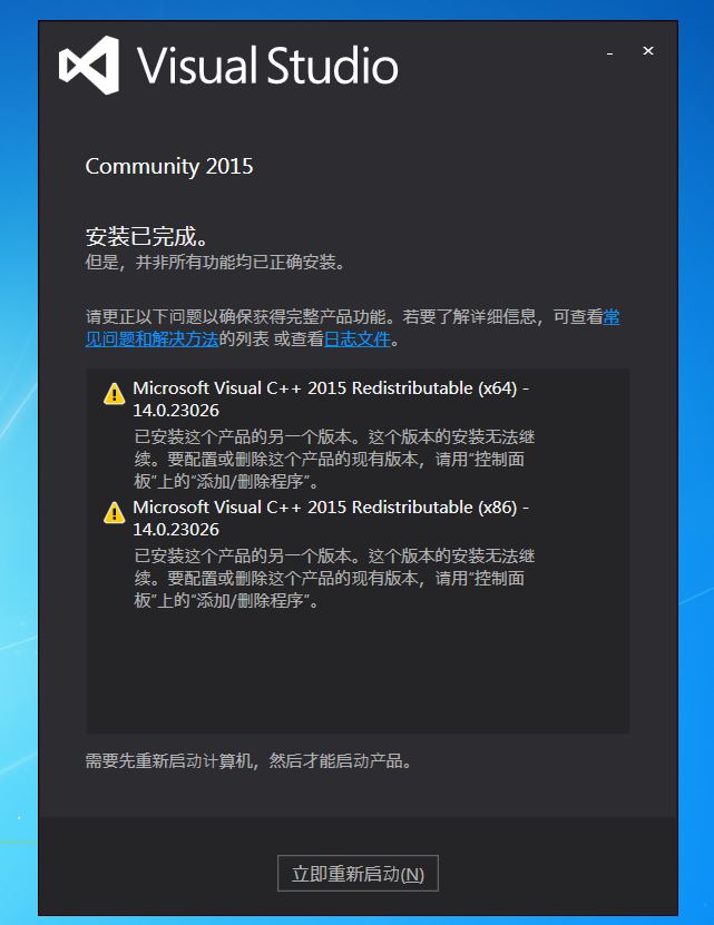由于种种原因,我需要使用VC14的编译器,便卸载了VS2013,安装VS2015,VS2013的卸载我只是在控制面板中卸载,VS最终也提示所有部件已卸载成功了的,所以我开始了VS2015的安装,可是出现了一下问题,如题。在网上看到了一些在命令行卸载的办法,于是我又尝试使用命令行卸载的办法,将VS2013和VS2015卸载,卸载都没什么问题,但是安装还是这样的问题。请问我该怎样办呢?有没有不重装系统的办法?