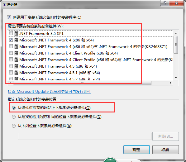 选择“从组件供应商的网站上下载系统必备组件”,这样一来,即使电脑上没有安装需要的.net Framework也不要紧,只要设置了这项,安装程序会自动从微软的官网上下载对应的组件并安装,是不是很方便