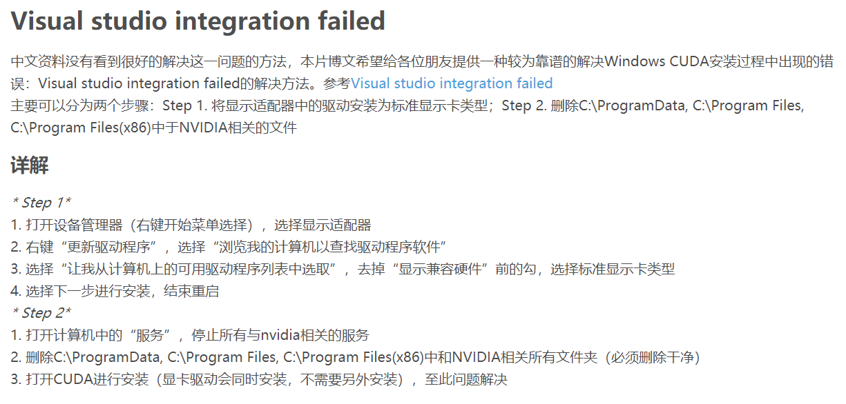 也失败了,但我参考了其中的一些做法,把CUDAVisualStudioIntegration文件夹复制出来,在安装好其他的后,再单独安装CUDAVisualStudioIntegration中的两个可执行文件,然后,就会报错,然后按照提示进行解决即可,最后成功安装。