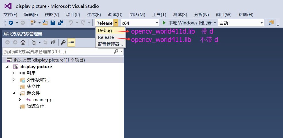 注:opencv_world411.lib对应 Release 模式版本 (不带d)