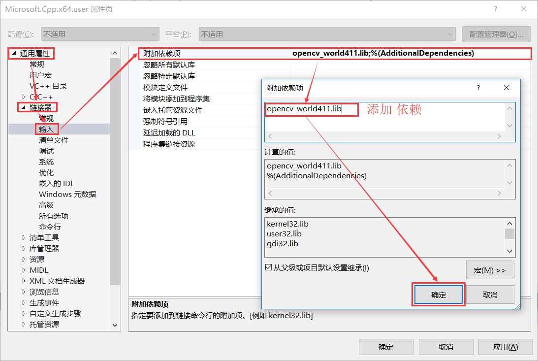 接着上步,在【通用属性】—【链接器】—【输入】—【附加的依赖项】