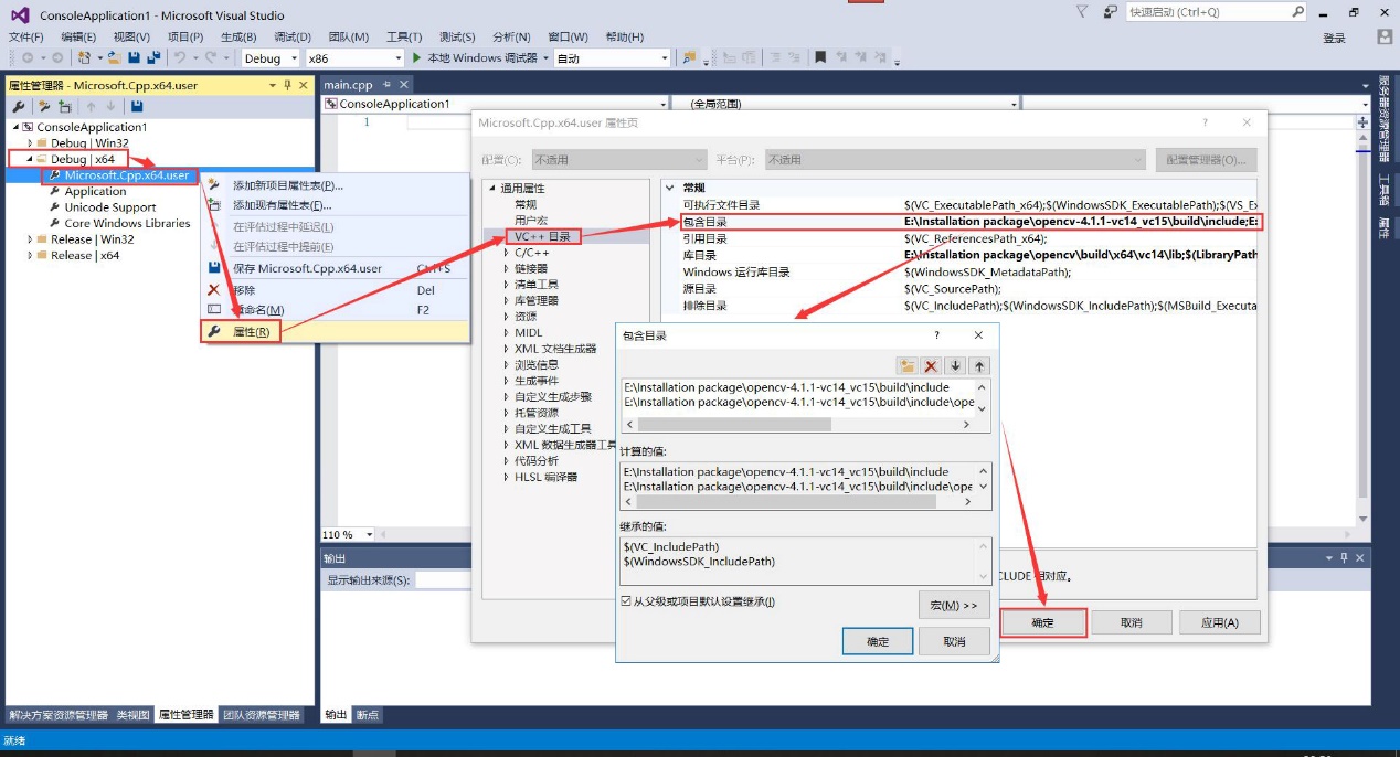 3.2.2 【属性管理器】—【Debug|Win64】—【Microsoft.Cpp.x64.user】(右键)—【属性】—【通用属性】—【VC++目录】—【包含目录】—【编辑】—添加2个目录