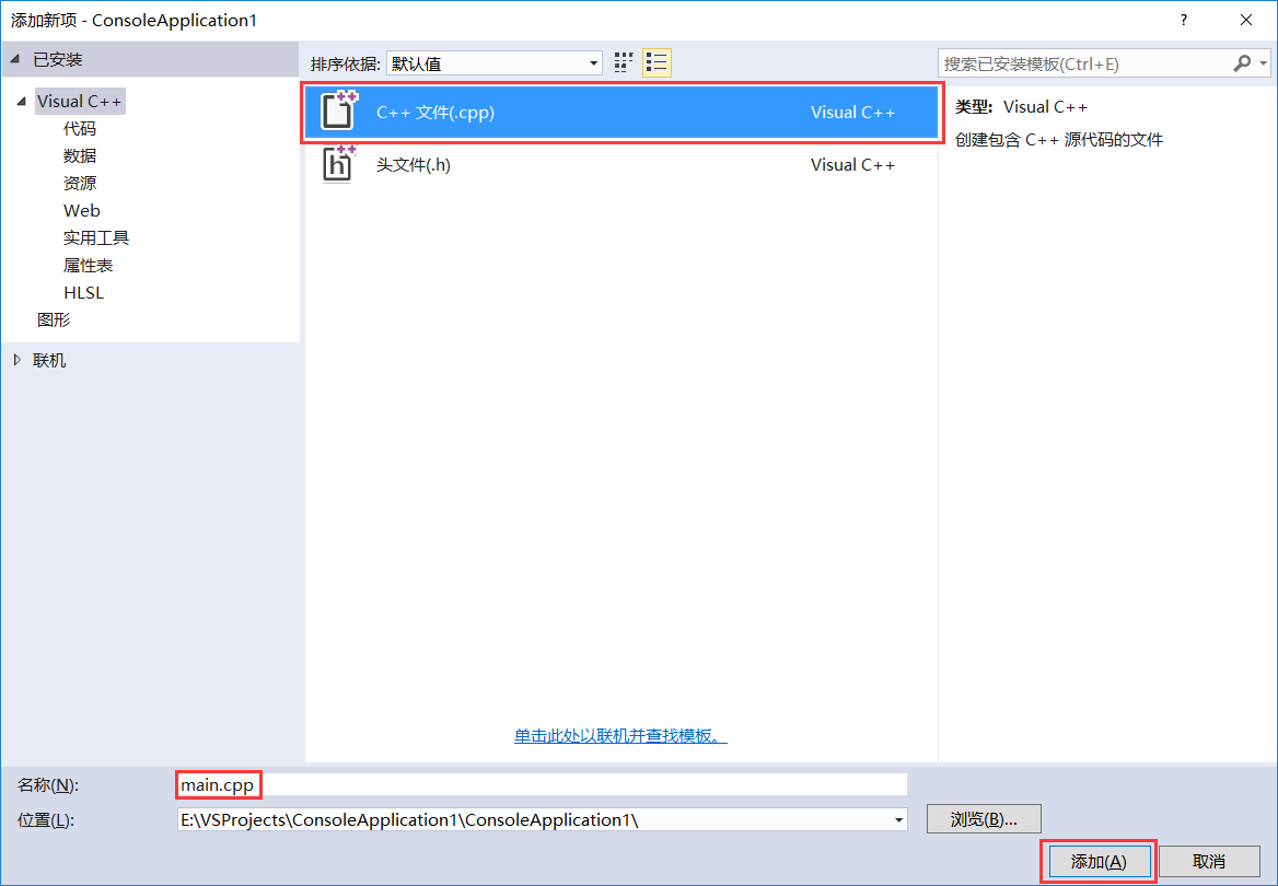 3.1.2 【源文件】(右键)—【添加】—【新建项】—【C++文件(.cpp)】—创建‘main.cpp’—【确定】