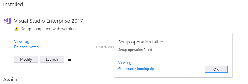 You can search for solutions using the information below, modify your selections for the above workloads and components and retry the installation, or remove the product from your machine.