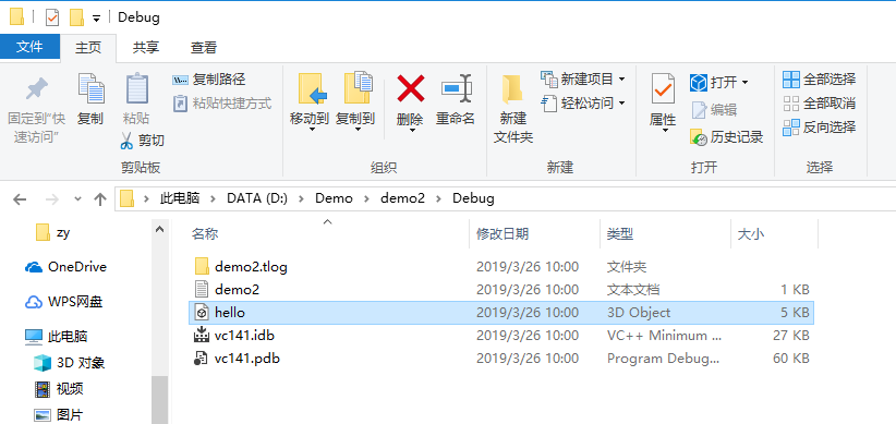 编译完成后,打开项目目录下(本教程中是 D:\Demo\ )的 Debug 文件夹,会看到一个名为 hello.obj 的文件,此文件就是经过编译产生的中间文件,这种中间文件的专业称呼是目标文件(Object File),在 VS 和 VC 下,目标文件的后缀都是 .obj 。