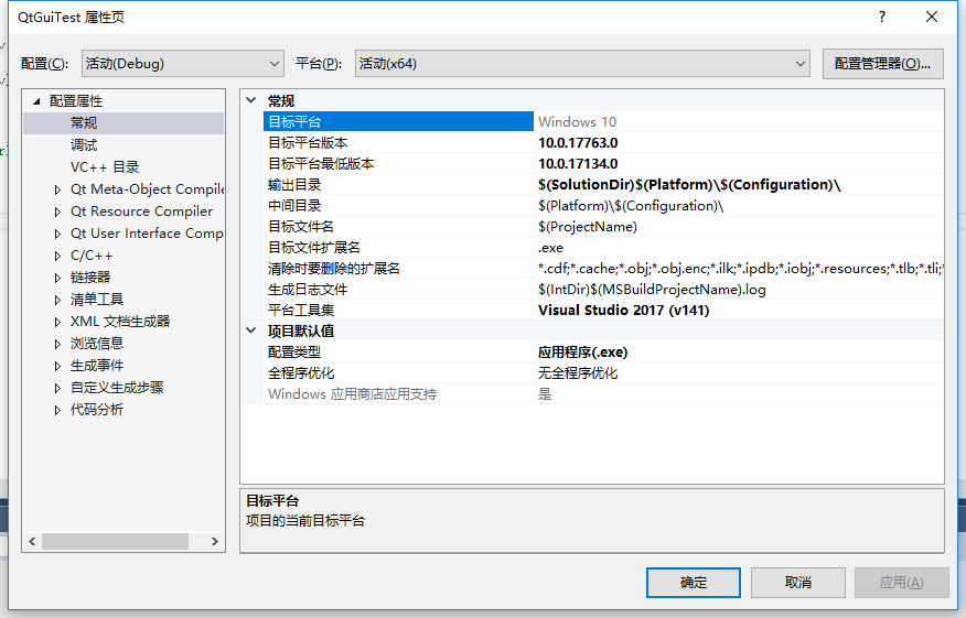 最后经过摸索发现需要配置windows平台版本,点击项目,选择最后的QtGuiApplication1(项目名称)属性
