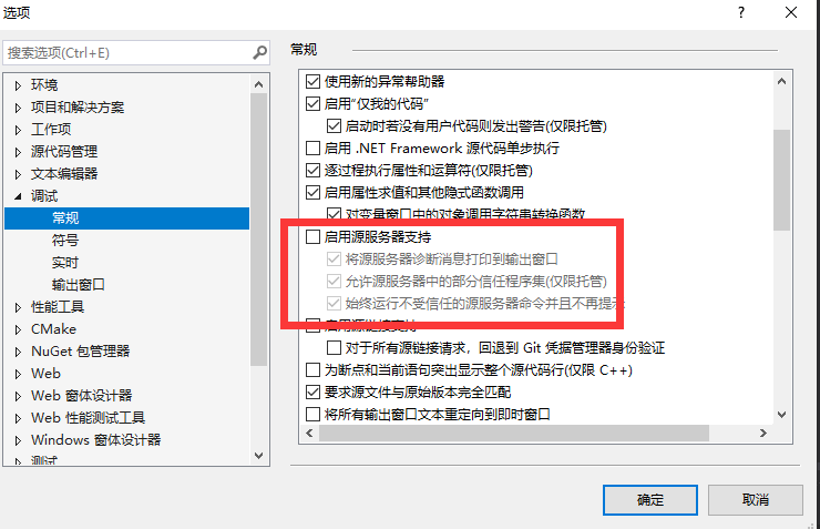 操作步骤:左键调试->选项->常规 勾选启动源服务器支持。