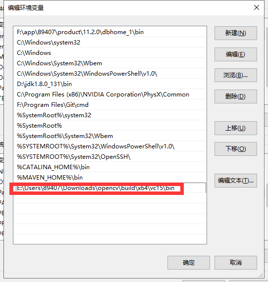 然后新建,添加“......opencv\build\x64\vc15\bin”,为你的Opencv4.0解压(安装)目录,目录尽量避免中文路径,下文不再赘述。