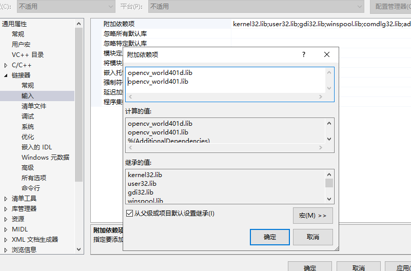 在通用属性—>链接器—>输入—>附加的依赖项中添加:opencv_world400d.libopencv_world400.lib