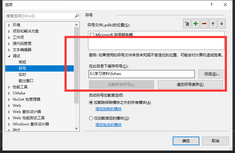 另外,其实到上一步已经配好了,但是到了关键时候VS2017总是说我少各种dll文件,百度上面说不用理这种错误,可以选择勾选微软符号服务器来下载缺失的dll文件。