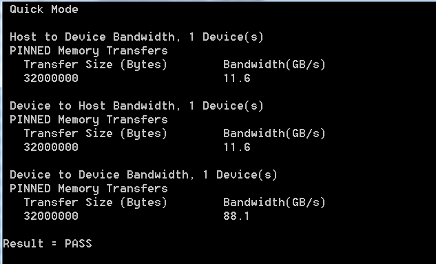 分别输入deviceQuery,bandwidthTest并运行,出现如下类似信息便说明CUDA安装成功