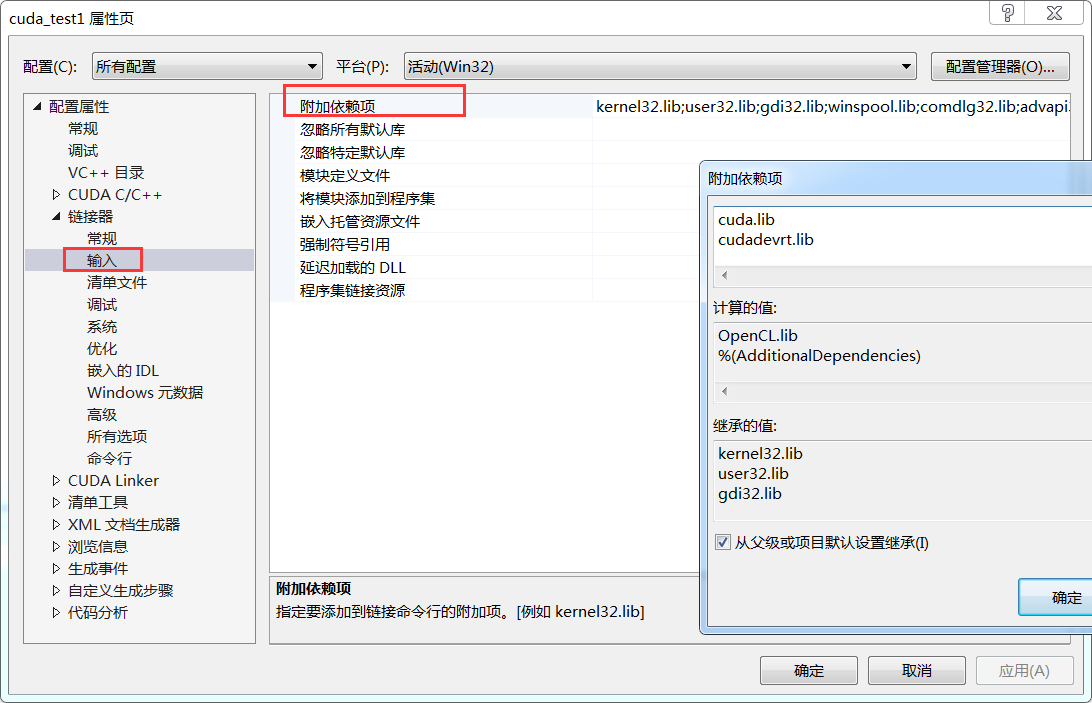 配置属性–>链接器–>输入–>附加依赖项
