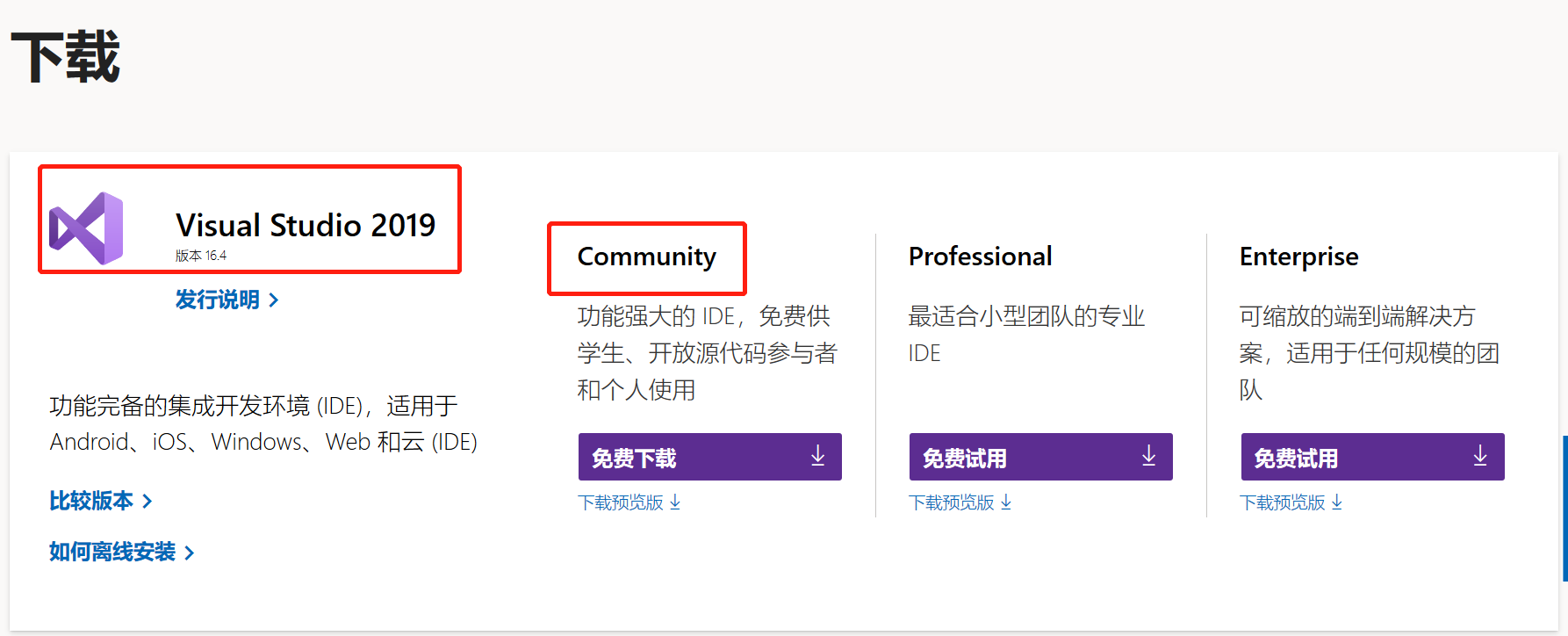 由于个人喜好装最新版,所以去官网下载的Visual Studio 2019 Community版本,VS2019官网下载地址,下载界面如图。