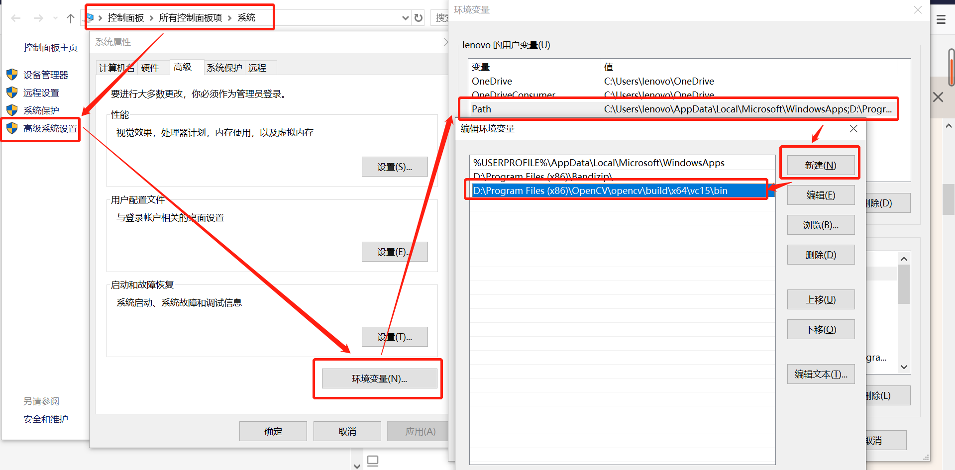 强调一下新建的路径,对于我的配置是 D:\Program Files (x86)\OpenCV\opencv\build\x64\vc15\bin,是vc15,并非vc14。