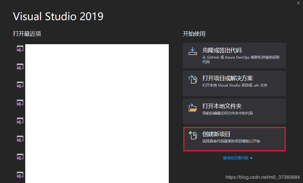 1.1打开VisualStudio2019,选择【创建新的项目】: