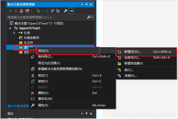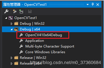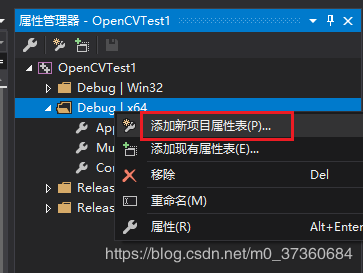 1.12 定位到1.9步骤中的属性管理器,发现 Debug|X64下并没有 Microsoft.Cpp.x64.user,需要自己新建配置,右键单击Debug|X64,选择【添加新项目属性表】,输入名称(自己起的任意)OpenCV410x64Debug: