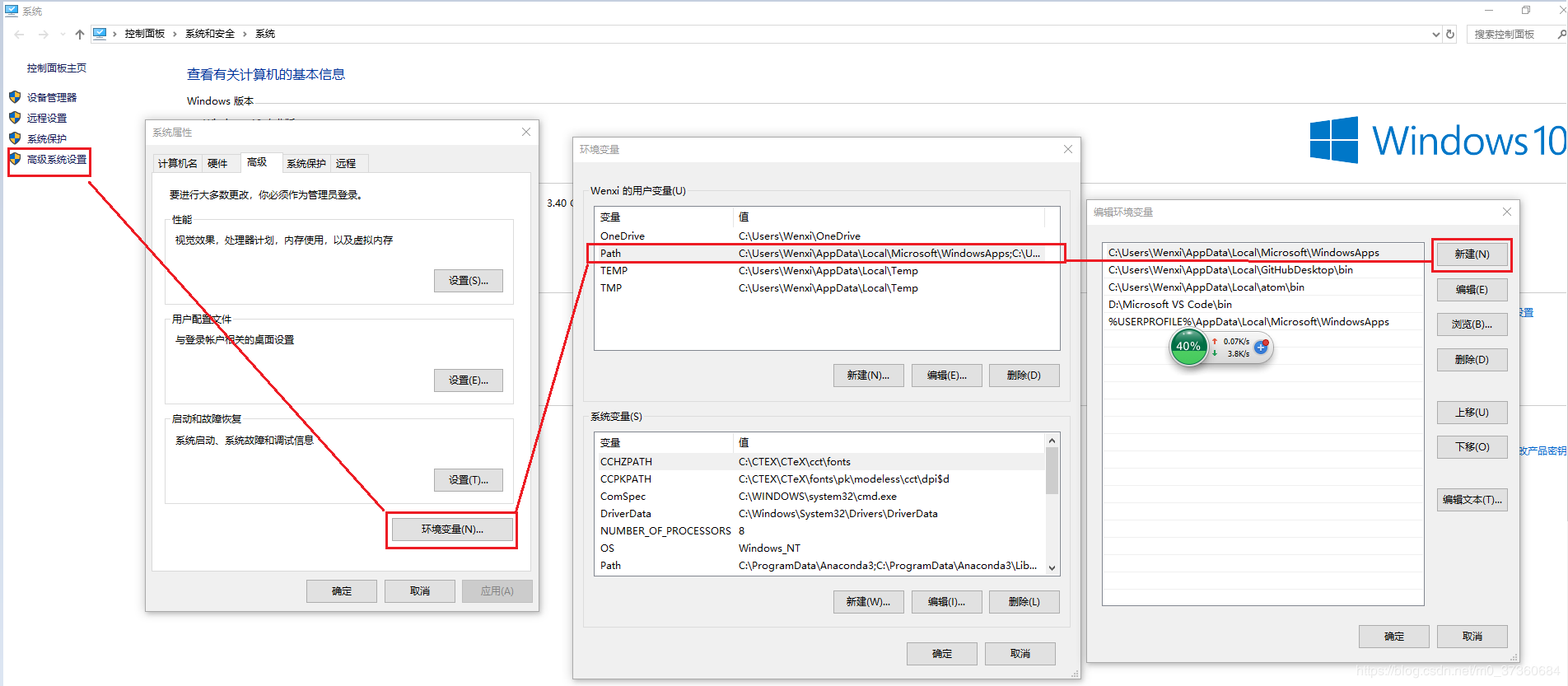 2. 选择【高级系统设置】--【环境变量】,双击【Path】,单击【新建】: