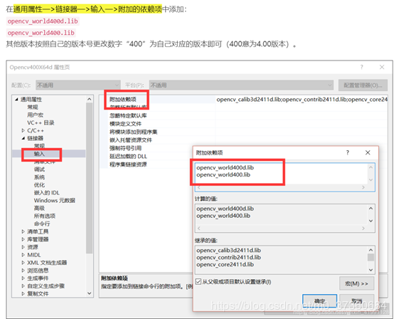 5.4 链接器>>输入>>附加依赖库>>添加 opencv_world400d.lib,不要同时将opencv_world400d.lib和opencv_world400.lib放到一起,会出Bug。