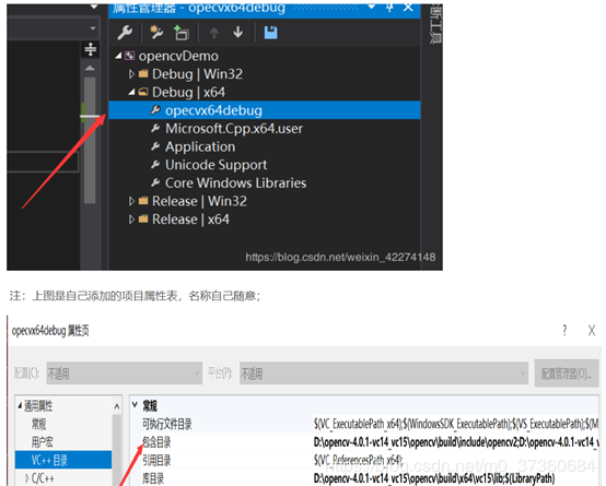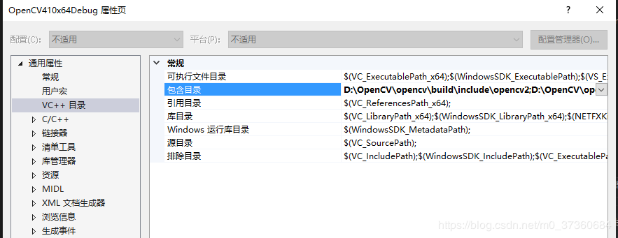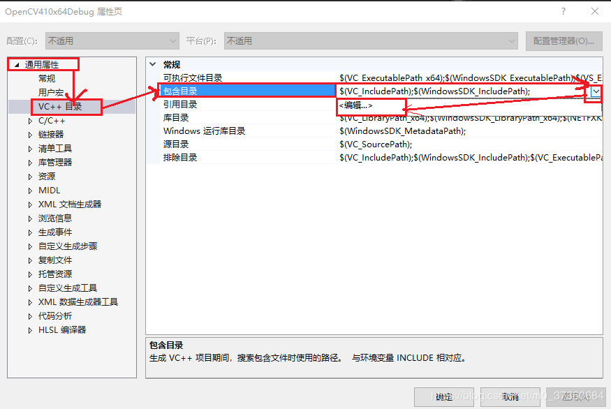1.13 双击新建的OpenCV410x64Debug,在【通用属性】-->【VC++目录】-->【包含目录】中, 点击最右侧的倒三角按钮,选择<编辑>,