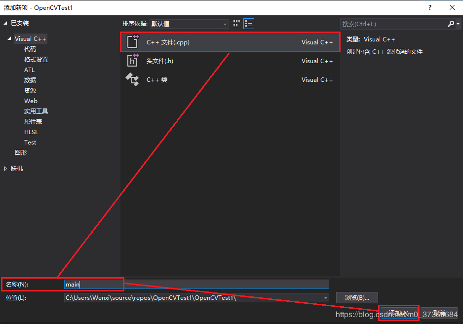 1.6选择【C++文件】,输入文件名称(比如main),点击【添加】: