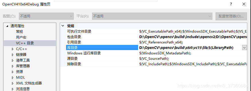 步骤与第1个步骤差不多,在【属性管理器】下双击OpenCV410x64Debug,在【通用属性】-->【VC++目录】-->【库目录】中,采用同样的方法(不要手动输入)添加 D:\OpenCV\opencv\build\x64\vc15\lib 这条路径,结果如下图所示: