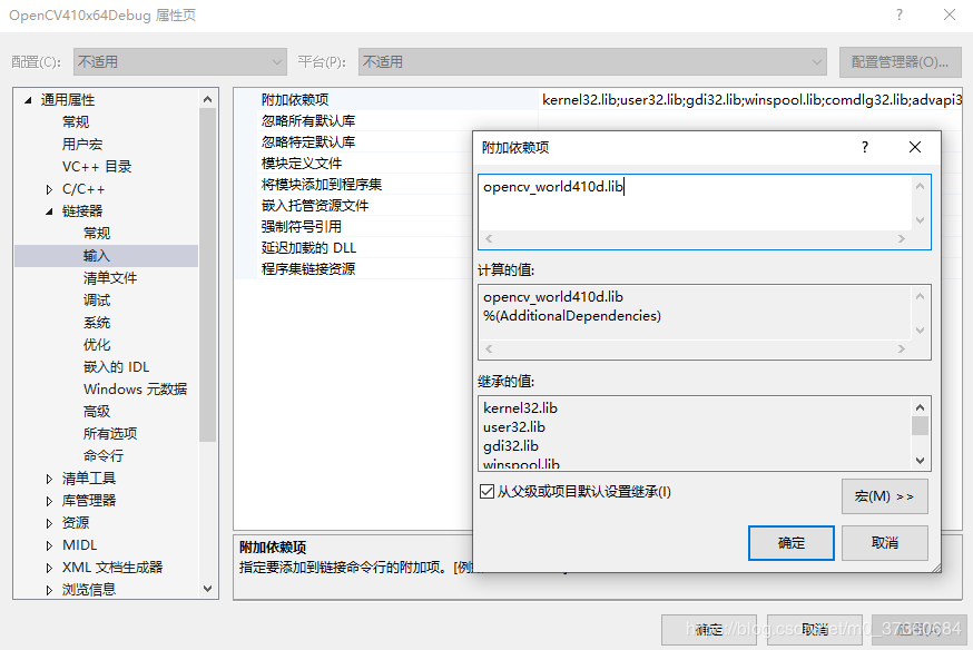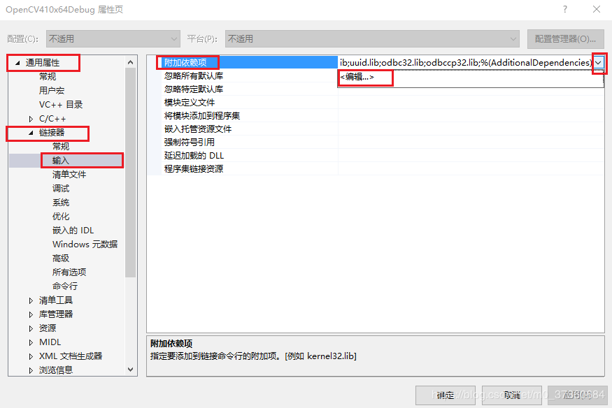 3.1 在OpenCVx64Debug属性页中,选择【通用属性】-->【链接器】-->【输入】-->【附加依赖项】,选择<编辑>: