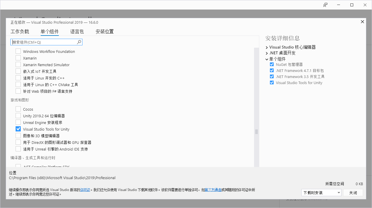 最近将vs升级到2019,安装组件时选择了 "Visual studio tools for Unity"