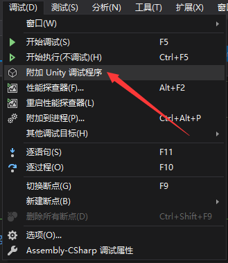 查找原因,原来是VS2019将“附加Unity调试程序”放到了“调试”菜单中