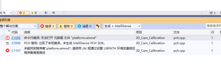 错误(活动) E1696 命令行错误: 无法打开 元数据 文件 "platform.winmd" 3D_Cam_Calibration D:\OASIS\sw_prj\3D_Cam_Calibration\3D_Cam_Calibration\pch.cpp 1