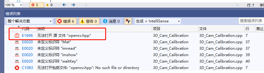 错误(活动) E2998 PCH 警告: 出现了未知错误。未生成 IntelliSense PCH 文件。 3D_Cam_Calibration D:\OASIS\sw_prj\3D_Cam_Calibration\3D_Cam_Calibration\pch.cpp 1