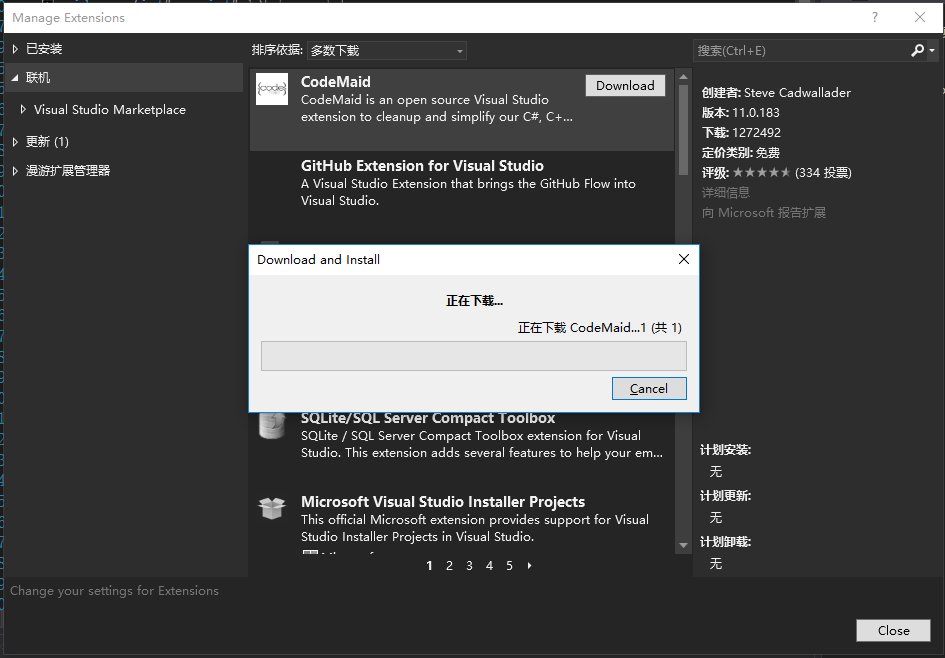 最后运行下载好的可执行文件(vsix): 这一步之前先关闭vs,没关闭的话安装的时候会弹出一个窗口,点击End Task就好了