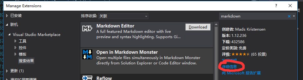 后来发现点右边的详细信息能够直接跳转到微软的介绍页上,这里也可以点击下载扩展,这时候用浏览器下载或者是什么迅雷之类的就随你喜欢了